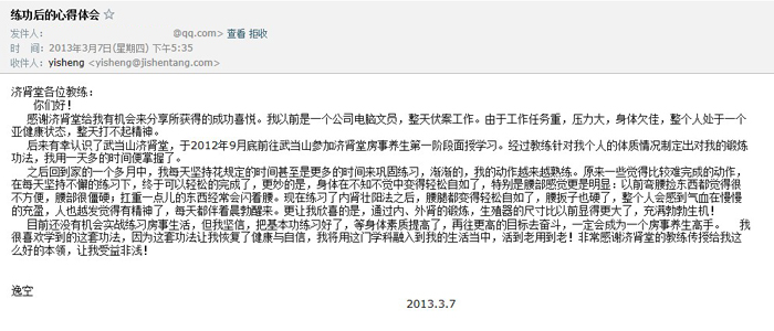 我很喜欢学到的这套功法,因为这套功法让我恢复了健康与自信,我将用这门学科融入到我的生活当中,活到老用到老!非常感谢济肾堂的教练传授给我这么好的本领,让我受益非浅!