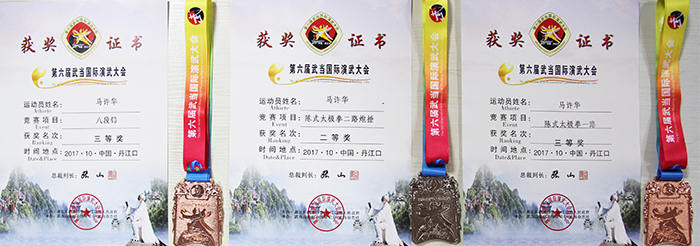 在2017年武当国际演武大会中同时荣获陈式太极拳二路炮锤银牌、陈式太极拳一路铜牌、八段锦铜牌。