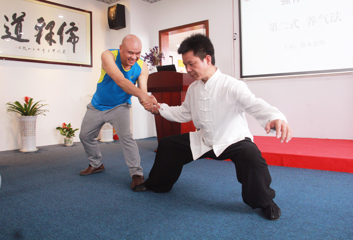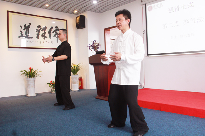 在传授强肾七式前三式的功法中,静木老师讲解了每个功法的科学编排和功效,带功时对每个功法进行细致的传授,并逐一给每位参加者作规范辅导和指正,耐心解答大家提出的问题。