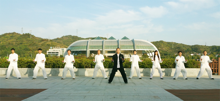逸仙老师带领老会员们在善水街湖边练习强肾七式