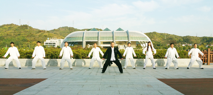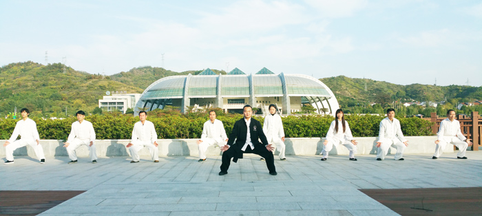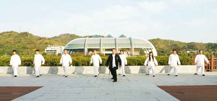 逸仙老师带领会员们在善水街湖边练习清肺内功