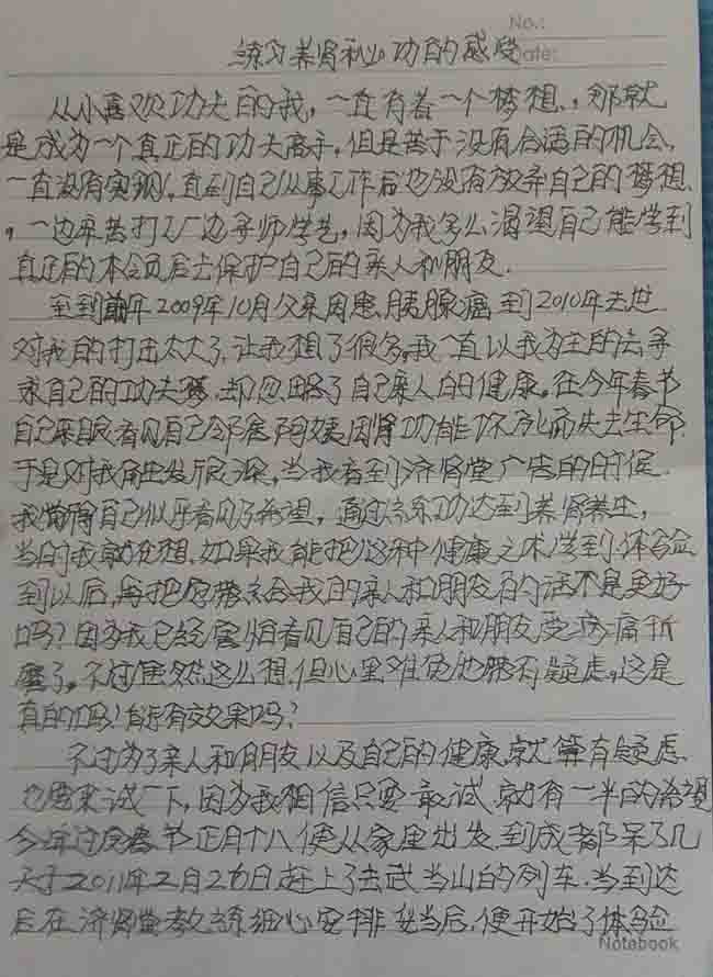 直到前年2009年10月父亲因患胰腺癌到2010年去世,对我的打击太大了,让我想了很多,我一直以我为主的去寻求自己的功夫梦,却忽略了自己亲人的健康,在今年春节自己亲眼看见自己邻居阿姨因肾功能坏死而失去了生命,于是对我触发很深,但我看到济肾堂网站的时候,我觉得自己似乎看见了希望,通过练功达到养肾养生,当时我就在想,如果我能把这种健康之术,学到体验到以后,再把它带给我的亲人和朋友的话不是更好吗?因为我已经害怕看见自己的亲人和朋友受病痛折磨了,不过虽然这么想,但心里难免也带有疑虑,这是真的吗?能有效果吗?