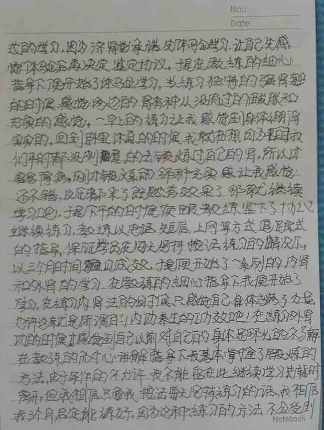 于是下午的时候便跟教练签下了协议继续练习,教练以电话、短信、上网等方式追踪式的指导,保证学员在每天坚持按法练习的情况下,以三个月的时间见成效。于是便开始了一系列的内肾和外肾的学习,在教练的细心指导下,我便开始了学习,在练习内肾法的时候只感觉自己身体充满了力量,也许这就是所谓的内功养生的功效吧!在练习外肾功的时候才感觉到自己以前对自己的身体是那么的不了解,在教练的耐心讲解指导下,我基本掌握了锻炼的方法,由于条件的不允许,我不能留在此继续学习,先暂时离开,但我相信只要我按法每天坚持练习的话,我相信我三个月后定能练好,因为这种练习的方法,不会受到工作的影响,我可以边上班边练习,等练习好后再继续回来实现我的梦想,于是在离开之际特写下此感受以表示对济肾堂事业的肯定,对济肾堂教练的感谢!