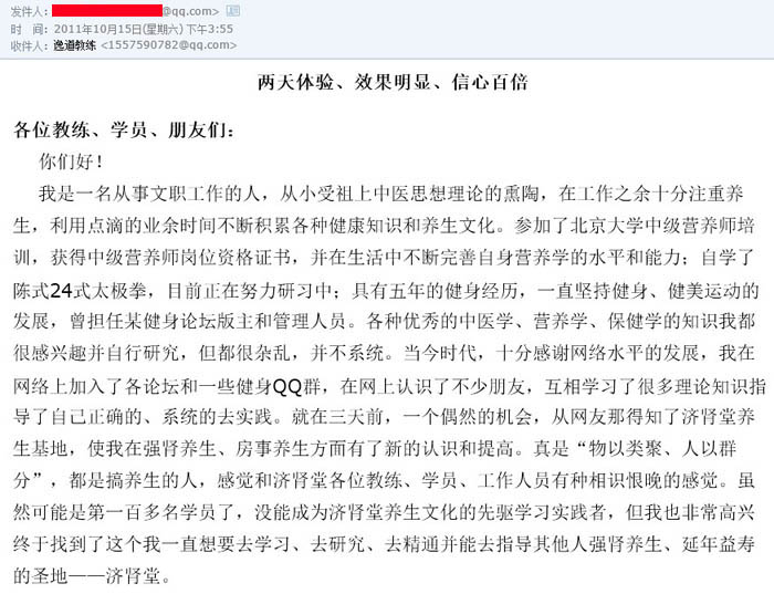 当天晚上就加上了济肾堂一名工作人员的QQ,成为了QQ好友。第二天上午便咨询了报名事宜,并在中午的午休时间联系了逸道教练并汇款、预约、报名成功,成为了一名济肾堂的学员。