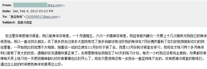 我是12月份到济肾堂去学习,我现在才练习两个多月身体和以前有了很大的改变,遗精的状况遗精恢复正常了,去那里教练给我制定了60天的练习计划,每天一小时我还没有完全做到,效果都非常棒。