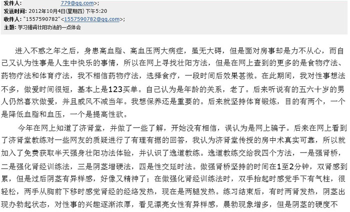 今年在网上知道了济肾堂,并做了一些了解,开始没有相信,误认为是网上骗子。后来在网上看到了济肾堂教练对一些网友的质疑进行了有理有据的回答,我认为济肾堂传授的房中术真实可靠,所以就加入了免费获取半天强肾壮阳功法体验,并认识了逸道教练。