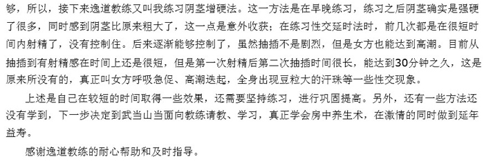 上述是自己在较短的时间取得一些效果,还需要坚持练习,进行巩固提高。另外,还有一些方法还没有学到,下一步决定到武当山当面向教练请教、学习,真正学会房中养生术,在激情的同时做到延年益寿。